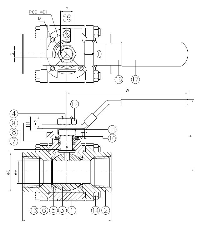 | Size (NPS) | d | D | L | H | H1 | H2 | W | S | D1 | M | P | ISO 5211 | Torque (in-lb) | Weight (lb) |