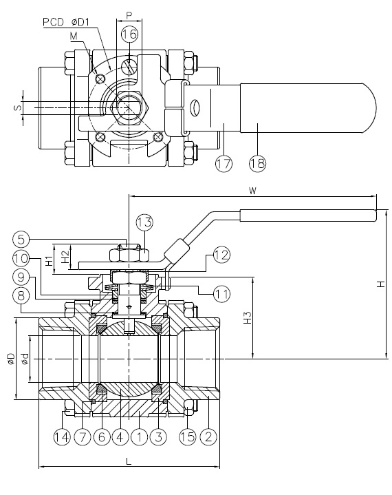| Size (NPS) | d | D | L | H | H1 | H2 | H3 | W | S | D1 | M | P | ISO 5211 | Torque (in-lb) | Weight (lb) |
