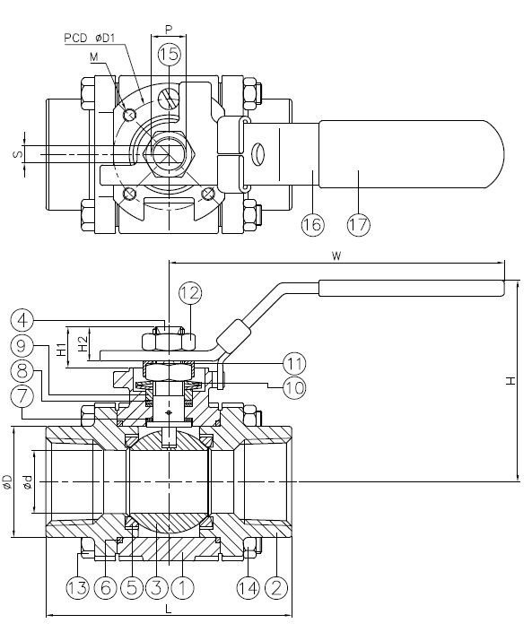 | Size (NPS) | d | D | L | H | H1 | H2 | W | S | D1 | M | P | ISO 5211 | Torque (in-lb) | Weight (lb) |