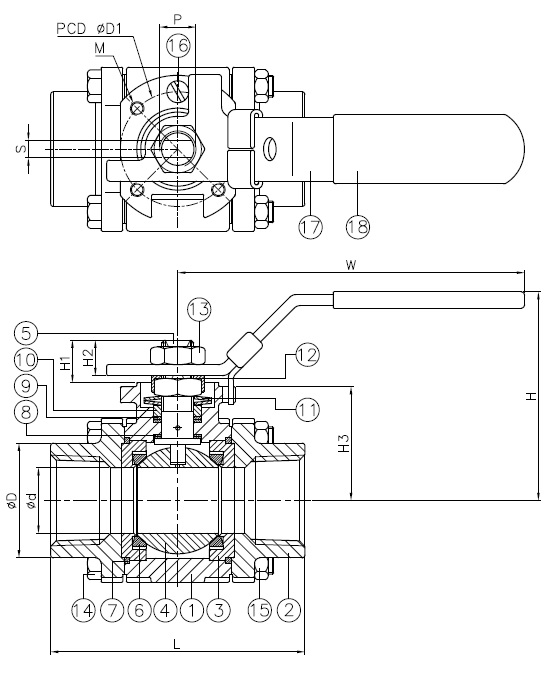 | Size (NPS) | d | D | L | H | H1 | H2 | H3 | W | S | D1 | M | P | ISO 5211 | Torque (in-lb) | Weight (lb) |