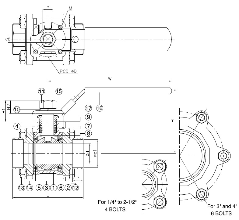 | Size (NPS) | d | d1 | L | L1 | H | H1 | H2 | W | S | D | M | P | ISO 5211 | Torque (in-lb) Max | Weight (lb) |