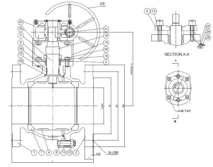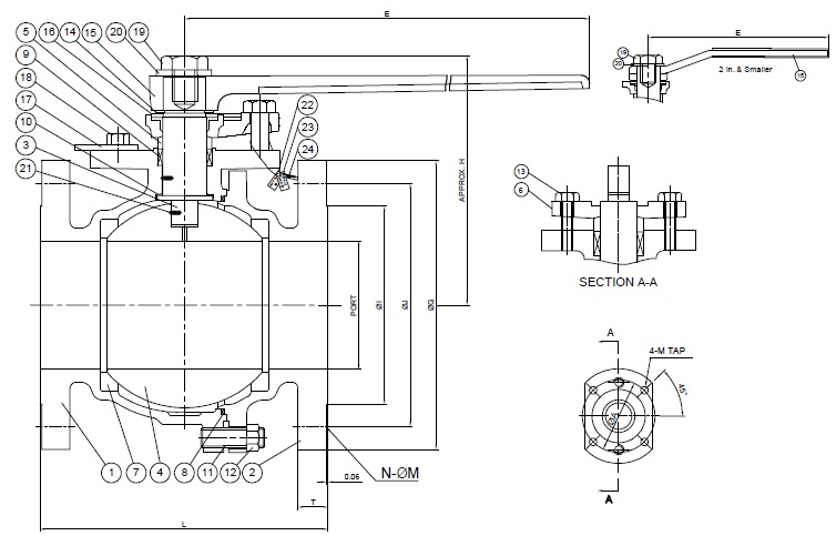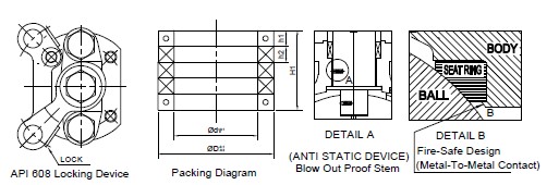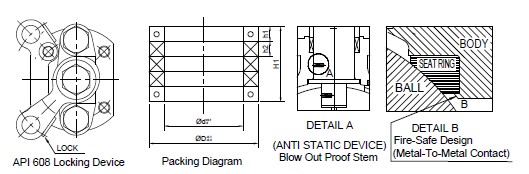| Features | ABS Certified; ISO 5211 Mounting Pad; Anti-Static Device; Pressure Relief Vent on Ball; Lever & Worm Gear; HNBR O-Rings on All 600# Design | |