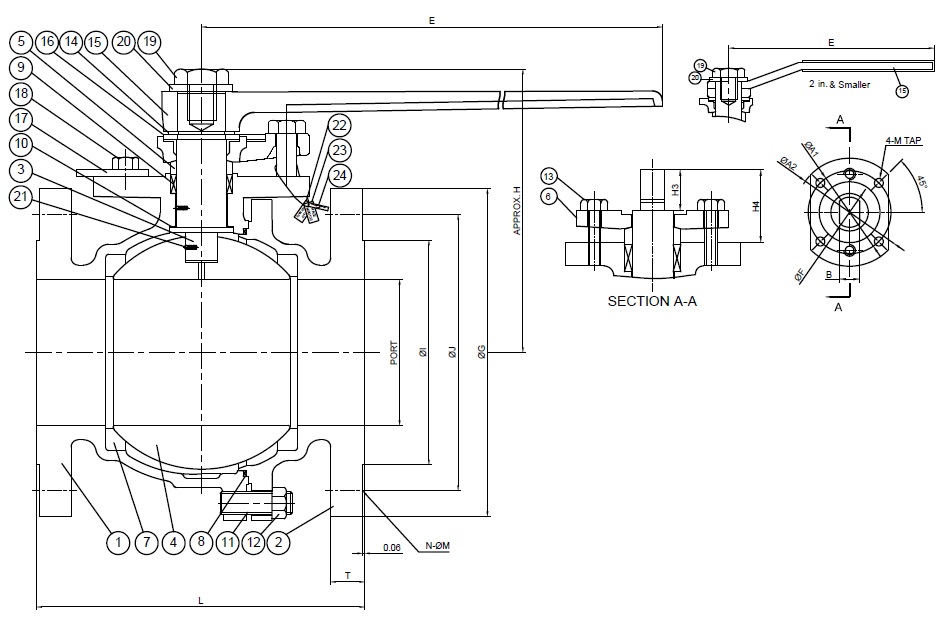 | Size | PORT | L | E | H | ØI | ØJ | ØG | T | N | ØM | ØD | Ød | H1 | h1 | h2 | Weight (lbs) | CV (GPM) | Torque (lbf.in) | Body Bolts Torque (lbf.in) |