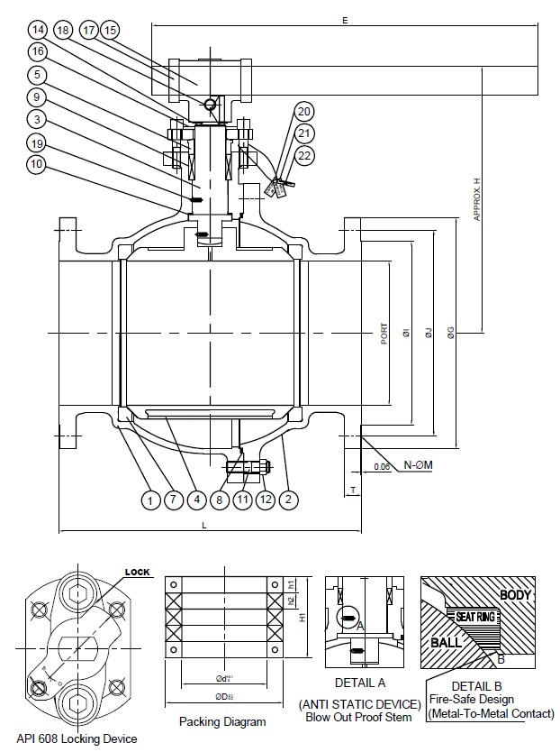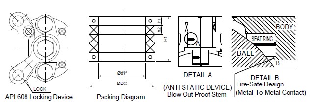 | Features | ABS Certified; ISO 5211 Mounting Pad; Anti-Static Device; Pressure Relief Vent on Ball; Lever & Worm Gear; HNBR O-Rings on All 600# Design | |