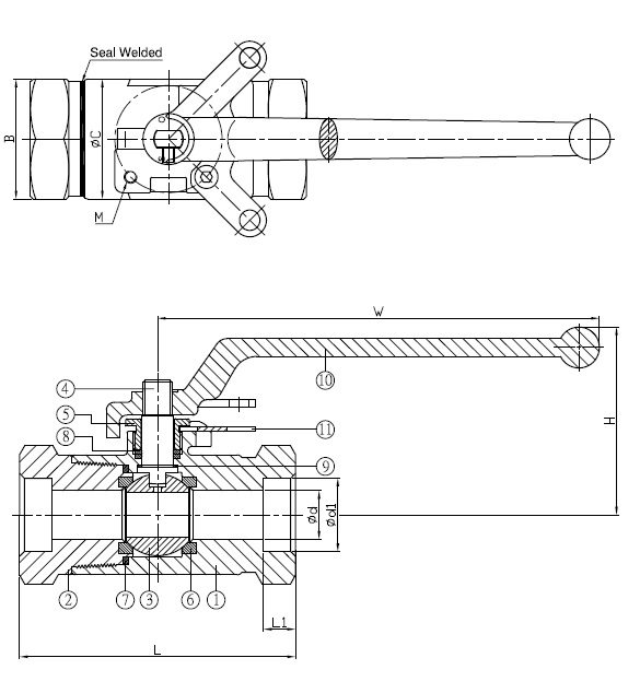 | Size (NPS) | d | d1 | B | C | L | L1 | H | W | M | ISO 5211 | Torque (in-lb) | Weight (lb) |